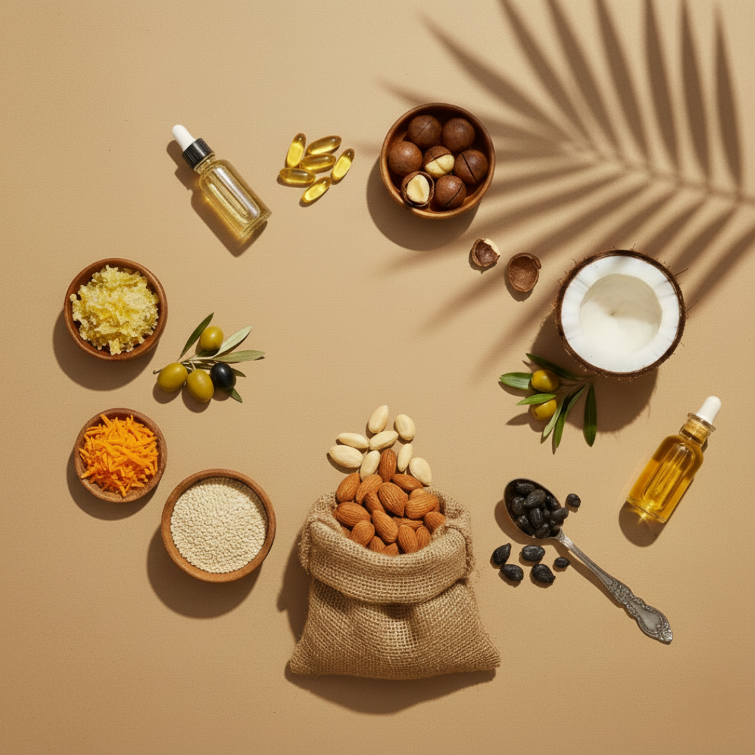 Vaseline, Huile minérale, Huile de ricin, Huile d’amande douce, Cire d'abeille, Huile de sésame, Extrait de carotte, Huile de jojoba, Huile d’argan, Huile de macadamia, Vitamine E, Huile de coco, Huile d’olive, Filtres solaires